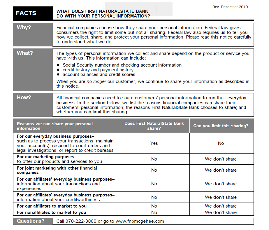 This web site may contain links to other sites on the Internet. Links to other sites are provided for your convenience and are not under the control of First NaturalState Bank. Such links do not imply First NaturalState Bank’s approval or endorsement of that site or its products or advertisements. Access to any other web sites linked to this site is at the User’s own risk. Links to this Web site are not permitted without the prior consent of First NaturalState Bank. Disclosure Product information contained on the First NaturalState Bank Web site does not take the place of required disclosures. For appropriate disclosures on personal and loan, accounts required under applicable federal and state regulations please contact us at (870) 222-3880.